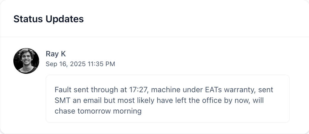 Every inspection, task, fault code, and service update flows into one live feed — automatically timestamped, tagged to the right asset, and visible to managers and operators in real time.